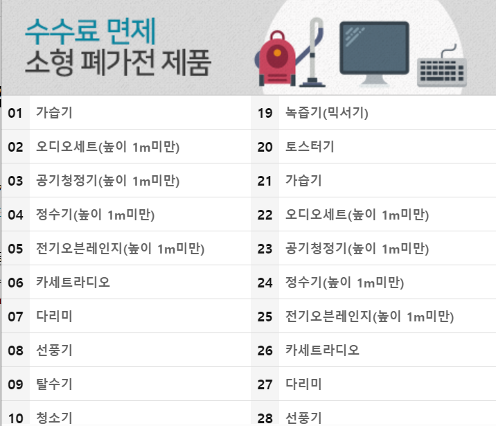 수수료가 면제되는 소형 가전제품은 위 항목들을 확인하시면 됩니다.