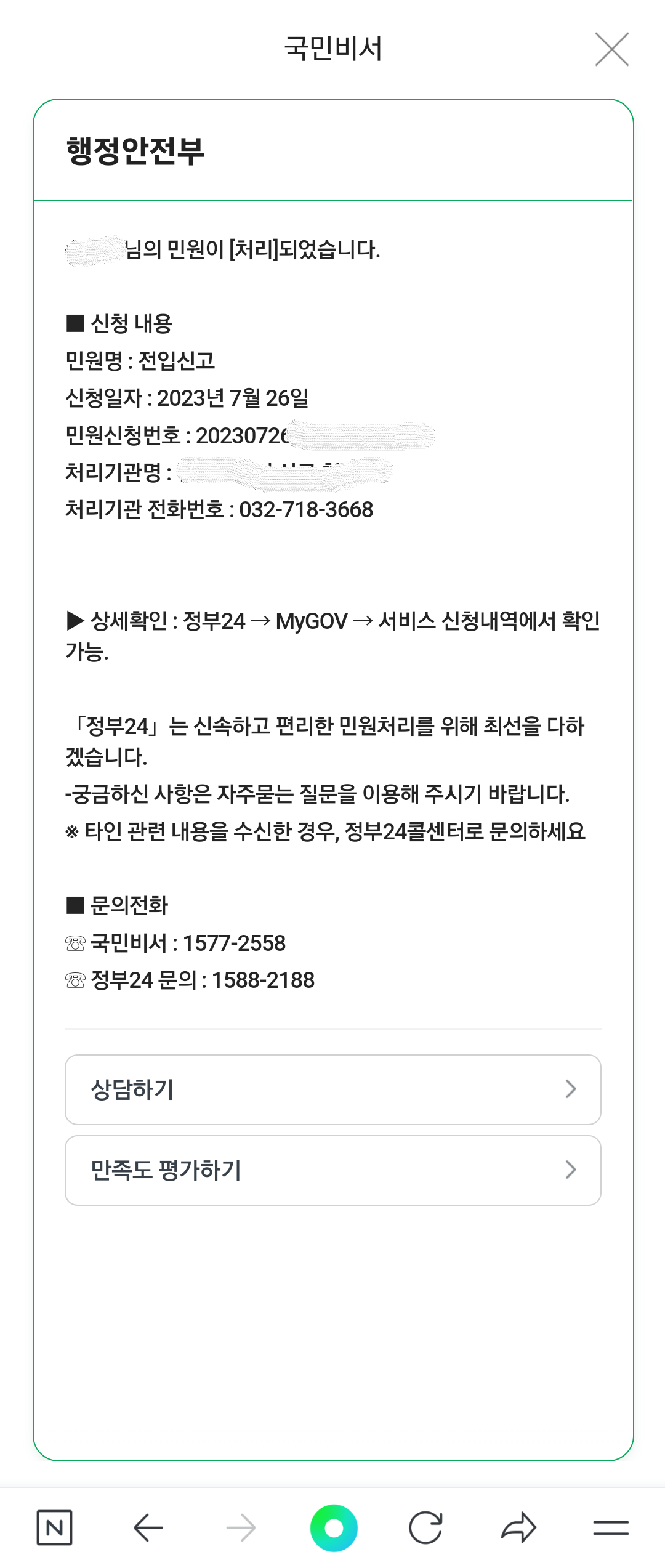 나는 네이버에서 국민비서 알림 설정을 해두어서 민원 진행과정마다 핸드폰으로 문서가 날라온다.