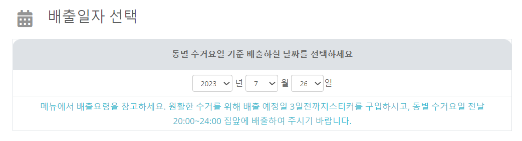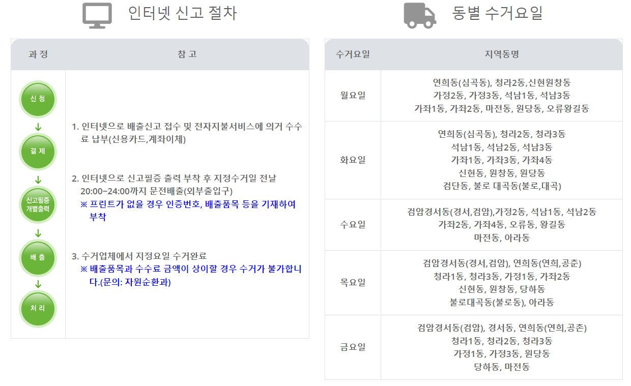 주의사항과 같이 동별 수거요일 전날 20:00~24:00 집 앞 수거장소에 배출해 주시면 됩니다.