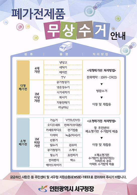 참고로 폐가전제품은 재활용품목이기 때문에 무상으로 수거를 하고 있으니 참고하여 주시기 바랍니다.