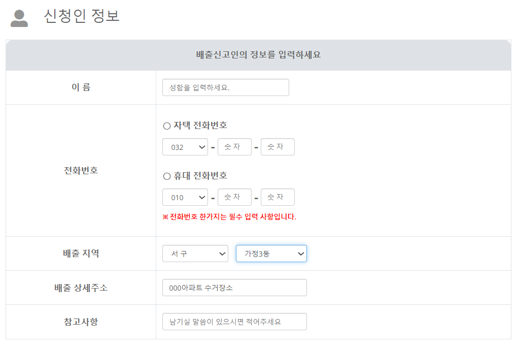 개인정보를 입력해주고 배출장소는 000아파트 수거장소라고 입력해 줍니다.