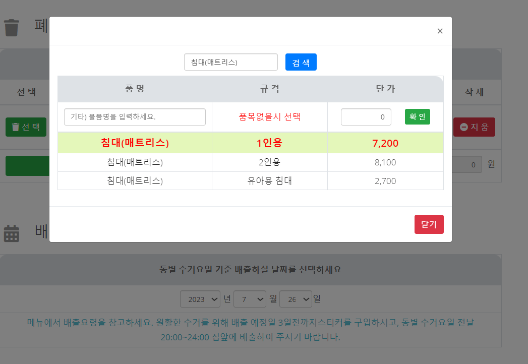 예를 들어, 위의 표에서 침대 매트리스 1인용의 수수료를 보면 8,000원인데